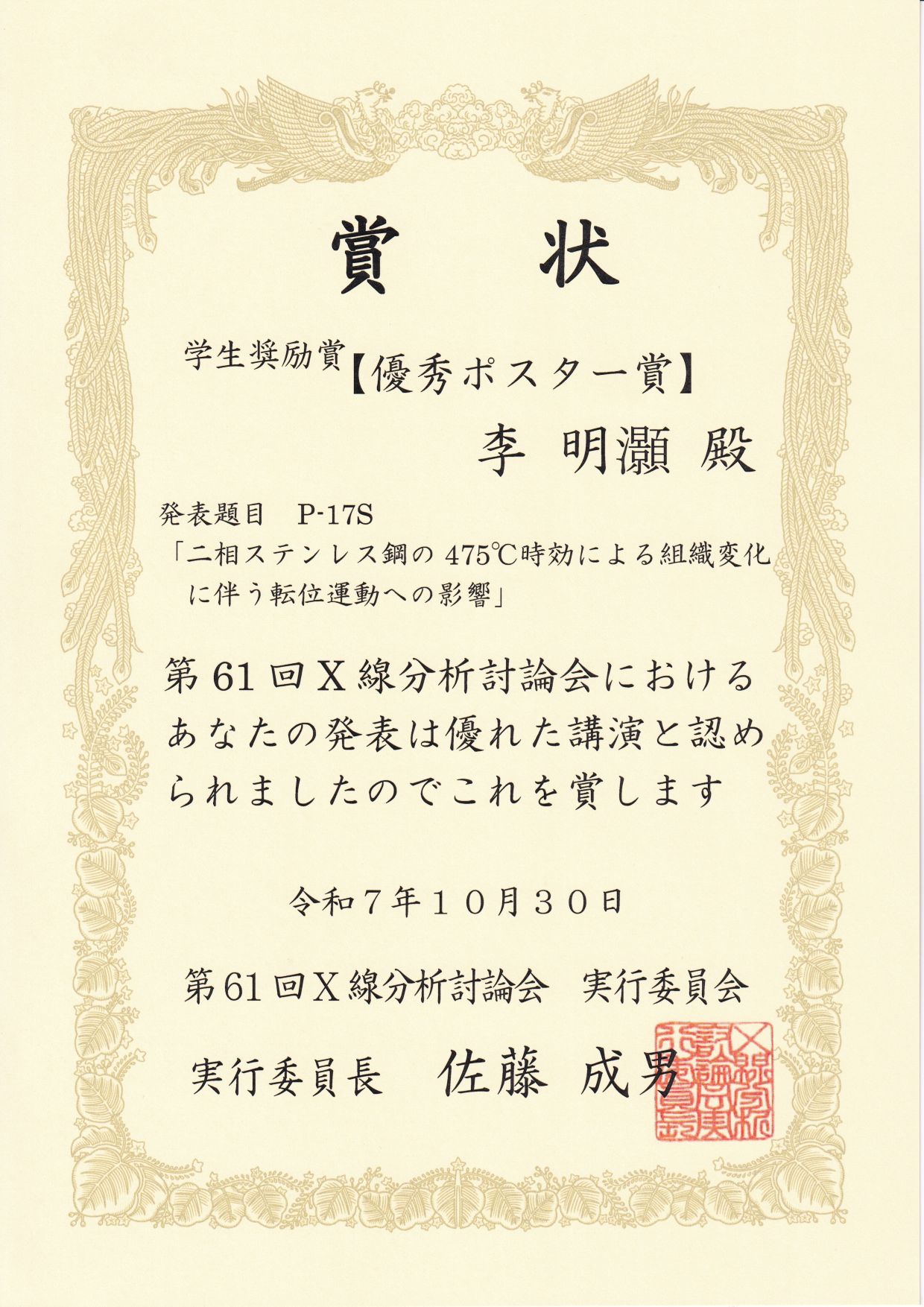 - 第61回X線分析討論会にて正岡優希さん(B4)とMinghao LIくん(M1)が優秀ポスター賞を受賞しました。(2025年10月)
