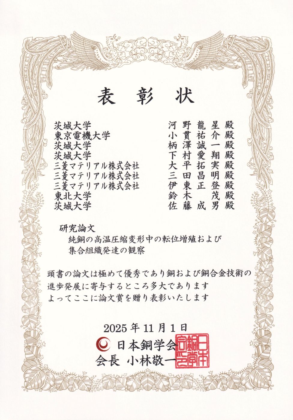 - 【日本銅学会第56回論文賞受賞】柄澤誠一,馬場可奈,小貫祐介,大平拓実,三田昌明,伊東正登,鈴木茂,佐藤成男